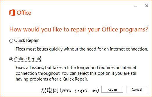 下一步取决于您的安装是即点即用还是MSI-基于。如果是即点即用,请选择在线修复-快速修复速度更快,但不够彻底。如果它是基于MSI的,请选择修复,然后单击继续。