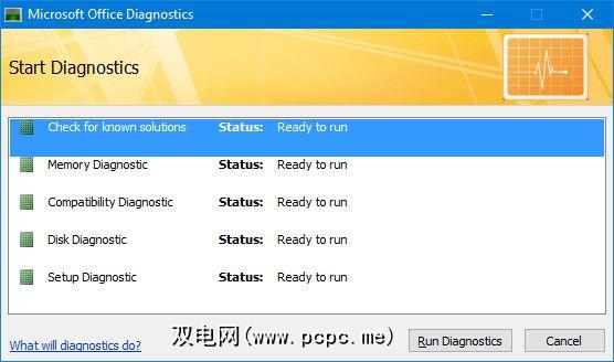 如果您不确定Office安装有什么问题,则运行Microsoft Office Diagnostics实用程序以获取更多信息可能很有用。 。无论是由于文件损坏,硬盘或RAM损坏或版本冲突引起的问题,此工具都应使罪魁祸首并提供解决方案。