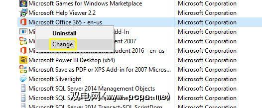 下一步,在搜索栏中键入程序和功能,然后打开控件面板结果。在程序列表中找到Office套件,右键单击它并选择更改。