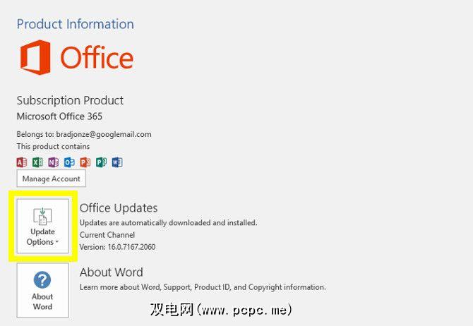 在下一个屏幕上标有更新选项的按钮中,您具有即点即用安装。如果不是,则说明您的安装基于MSI,请记下结果,然后关闭Word。