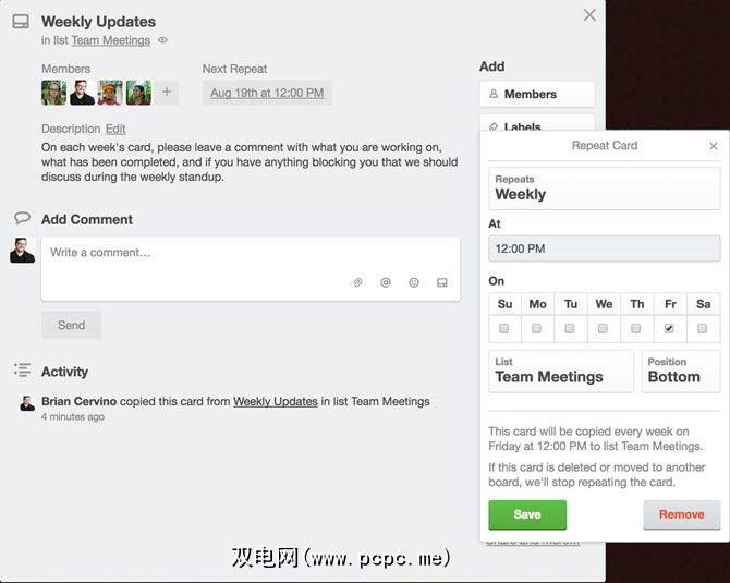 简单的定期提醒始终是强大的动力。在Trello上,您可以使用 Card Repeater (卡中继器)设置定期提醒。