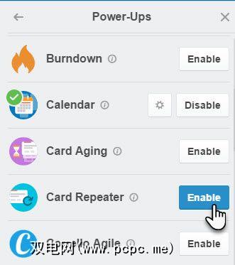 转到显示菜单>开机>卡中继器。启用它。您可以在任何Trello板上使用它。它将列在该卡可用的加电选项下。