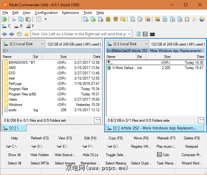 Multi Commander提供的选项远远超过File Explorer。其带有选项卡的两面板界面使您可以快速保持两个位置打开,并在两个位置之间移动文件,而无需任何其他软件。您可以直接从应用程序快速打开记事本或命令提示符窗口。窗口底部的按钮集合可让您隐藏所有文件夹,选择所有图像或查找重复项。