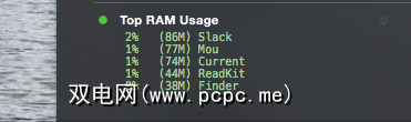 ps xmo rss=,pmem=,comm= | while read rss pmem comm; ((n++<5)); dosize="$[rss/1024]";short=$[4-${#size}];size="(${size}M)";i=0;while ((i++ < short)); do size=" $size"; done;pmem="${pmem%%.*}"if (($pmem >= 20)); then color=$'\e[31m';elif (($pmem >= 10)); then color=$'\e[33m';else color=$'\e[32m ';fi;echo "$color$pmem% $size $(basename "$comm")"$'\e[0m'"";done通过Today Scripts Wiki