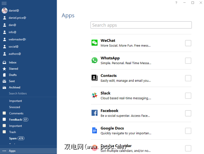 我使用Mailbird,可以高度推荐它。看起来很棒,它带有许多集成的生产力应用程序,并且可以完全自定义。