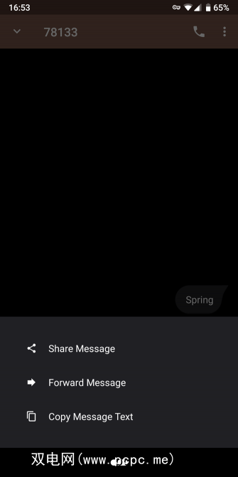 在Android上,这取决于您的硬件制造商和使用的SMS应用程序。通常,长按一条消息(注意不要点按任何链接)并寻找转发选项。如果看不到,可能是在三点式 Menu 按钮下。在如下所示的Pulse SMS中,您会在 Share 菜单下找到转发消息。然后,您可以输入 7726 发送新消息。