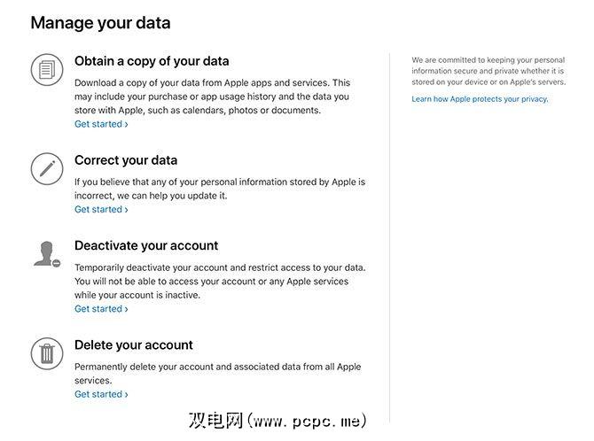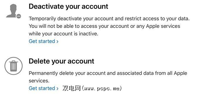 Apple的隐私微型网站还允许您停用和删除Apple ID您是否不再需要它。停用是一种临时措施,这意味着您不能使用与该帐户关联的任何Apple服务。