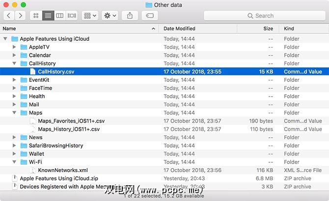 标题模糊不清的“其他数据"下载包括了Apple Maps中“收藏夹"位置的列表(它很薄,我不记得使用该功能了),我的Safari浏览历史记录,通话历史记录,与我的帐户相关联的已知Wi-Fi网络列表以及一长串iCloud使用事件(添加联系人,上传照片) )和与之关联的设备。