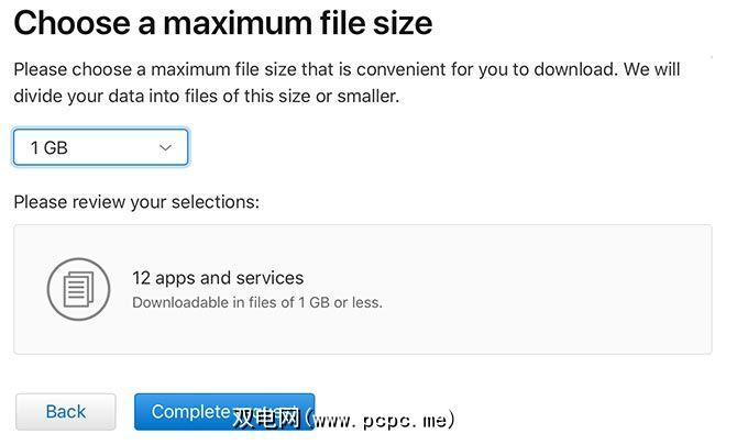 打开在下一个屏幕上,您将可以指定文件的大小。 Apple会将您的数据下载分成该大小的文件,因此您可以以较小的块下载它们(对于速度较慢,连接不完整的情况很方便)。单击完成请求以完成选择并坐下来。