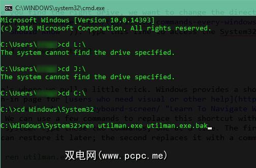 在这里您可以使用一些技巧。 Windows为需要视觉或其他帮助的用户提供了登录页面上“轻松访问"菜单的快捷方式。您可以使用一些命令来代替此快捷方式,以命令提示符代替,从而可以访问系统。键入这两个命令,一次输入一次。第一个备份“轻松访问"快捷方式,以便您以后可以恢复;第二个命令将其替换为命令提示符快捷方式。
