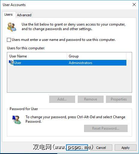 按 Win + R 打开运行菜单,然后键入 netplwiz ,然后按 Enter 。您会看到用户帐户对话框。在这里,单击您的帐户,然后取消选中用户必须输入用户名和密码才能使用此计算机框,然后单击确定。