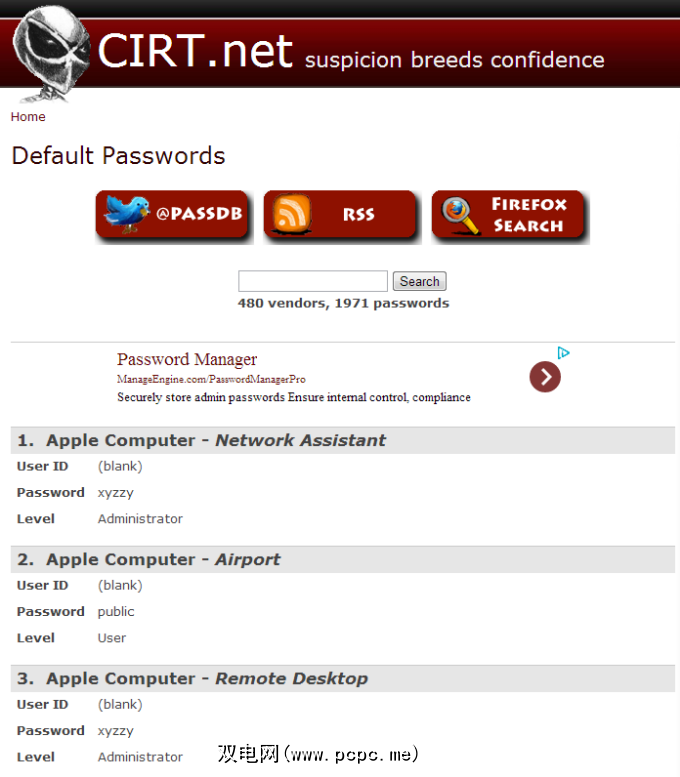 具有非常简单的界面和非侵入式广告,PasswordsDatabase.com通常是我的第二点停。它可能没有最大的数据库,但它是一个可靠的数据库,易于浏览。涵盖391个供应商的1600个密码,您应该能够找到所需的内容-用于大多数家用计算目的以及许多与工作有关的情况。该网站还按硬件的版本号细分内容。