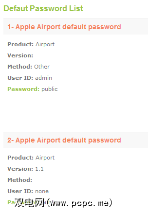 浏览信息与PasswordDatabase.com网站非常相似。您可以执行文本搜索或滚动浏览供应商列表,然后单击您感兴趣的供应商。由于苹果有两个单独的供应商条目,因此该列表似乎没有其他列表那么好管理:Apple和Apple Computers。仅使用Apple就产生了两个iPhone用户名和密码的结果。使用Apple Computers给我们带来了一些有关机场和Apple Networking的结果。