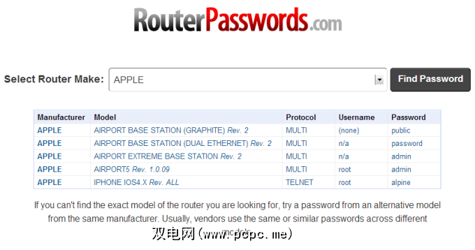 如果问题出在特别是对于路由器-对于家庭用户来说,通常情况似乎如此-RouterPasswords.com应该是您的第一站。域名绝对容易记住。只需从下拉框中选择路由器制造商,单击查找密码按钮,然后将列出它们制造的所有路由器以及用户名和密码的列表。