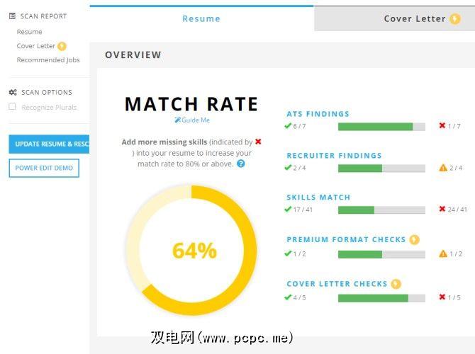 在这里,您将看到简历是否与您输入的职位描述相符,以及它可以通过ATS。遗憾的是,免费版本的Jobscan限制了您可以使用某些功能(如工作匹配率和关键字比较工具)的次数,但这仍然值得尝试。