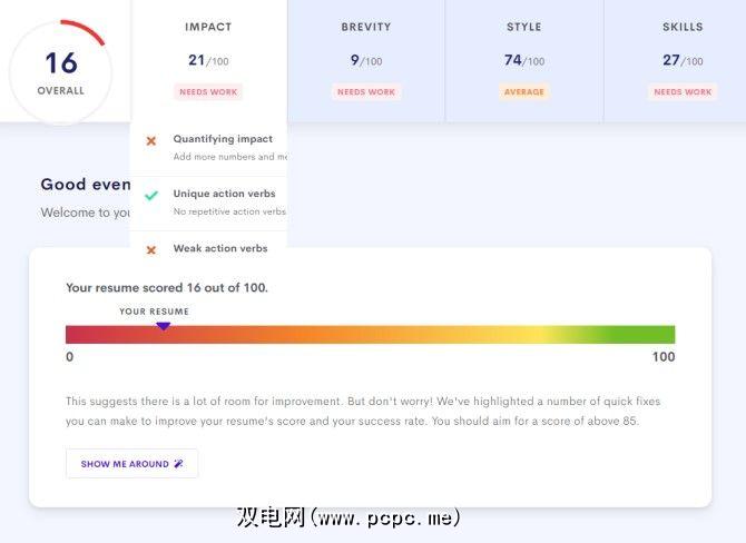 ResumeWorded是网络上最好的简历审阅网站之一。一旦您克服了注册网站的麻烦,就可以最终上传简历。上传文件后,您会看到应该对履历进行更改的页面。