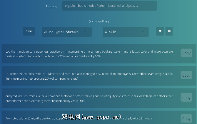 这是搜索成功简历行的引擎。选择您要寻找的工作类型和技能类型。您会看到一系列描述该领域成就的有效方法。只需复制粘贴,然后将其自定义为您所做的即可。当然,您始终可以搜索诸如Python或内容营销之类的特定内容。