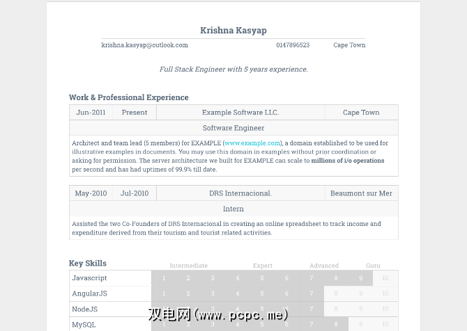 您基本上是将简历创建为迷你网站。您的每个部分都变成一张卡片,其中包含正确数量的信息。所有部分都在顶部列出,供读者单击或点击并直接带到那里。