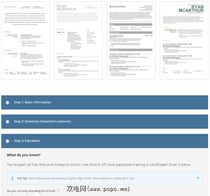 这是我见过的最好的无字符串附加在线简历制作工具。选择简历的样式,然后开始填写数据。在每个部分中,“ Resume Beacon"都提供有关说什么和避免什么的提示。继续直到完成所有五个步骤,然后查看提供的所有模板。