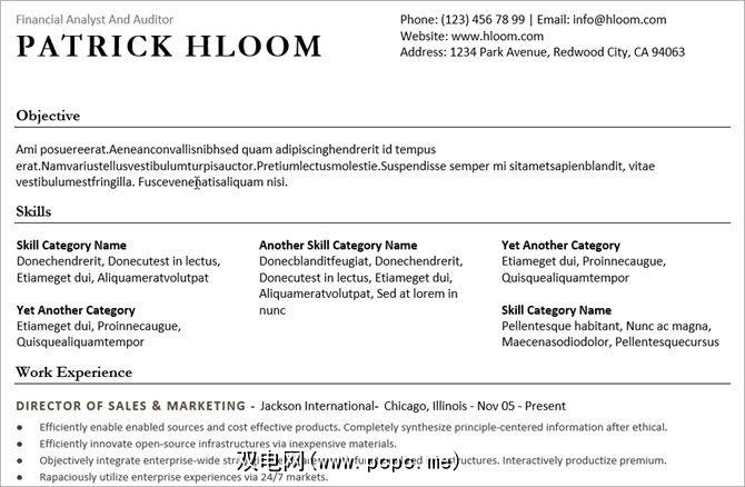 该模板似乎可以正常运行,并且顶部列出了技能,但“工作经验"部分也很突出。因此,当您确实要突出显示两者时,这是一个不错的选择。与许多其他模板一样,您可以包括一个目标,也可以根据需要删除该部分。