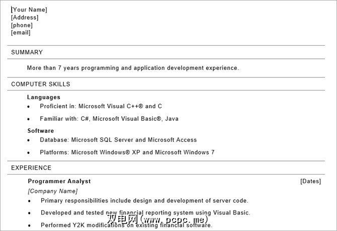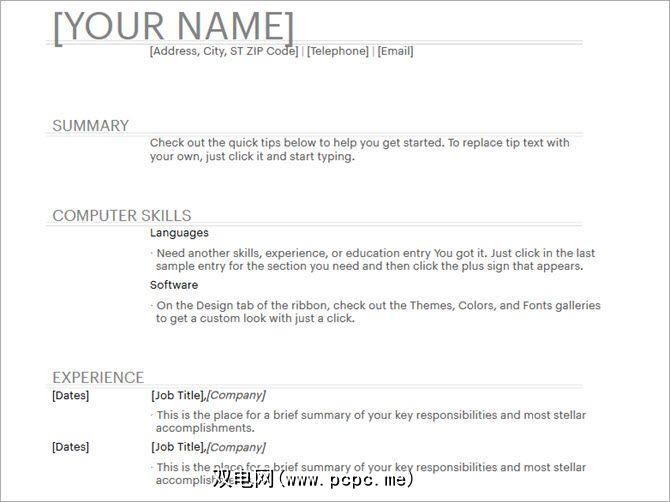 对于技术行业的人来说,这个免费的简历模板为您提供了一种展示技能的简单方法。如果愿意,可以从摘要开始,然后再讲计算机技能。接下来列出您的工作经历,并在其中列出要点,以突出您的职责,然后完成学业。