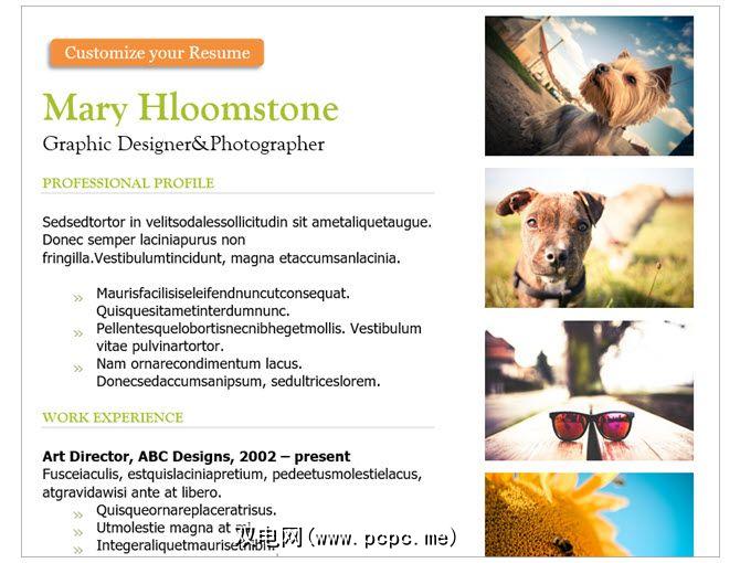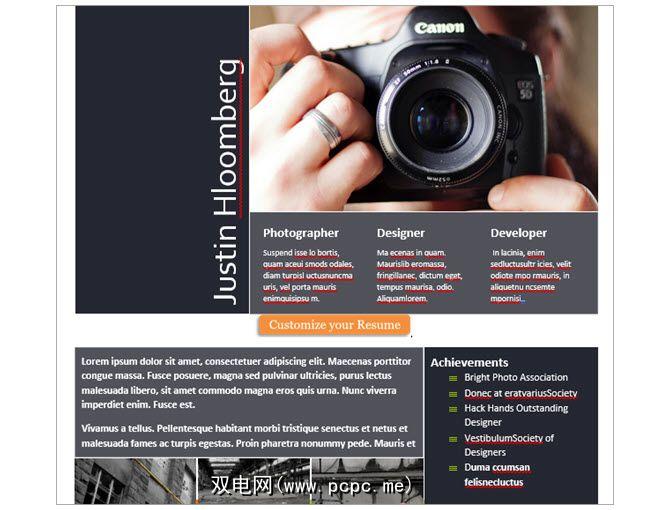 如果您喜欢显示设计或照片,这是另一个很棒的简历模板。您可以在顶部添加一张带有您的名称和标题的大图像。在其下面添加工作经验,然后将成就与更多的图片放在底部。