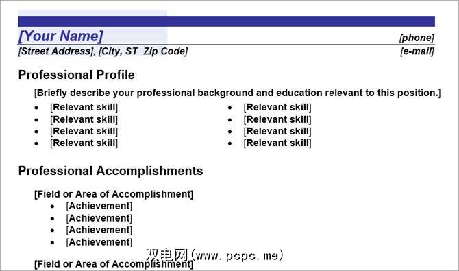 模板的第四部分标有“计算机技能",您可以用来添加自己的技能。但是您也可以使用此区域突出显示其他工作技能或成就。