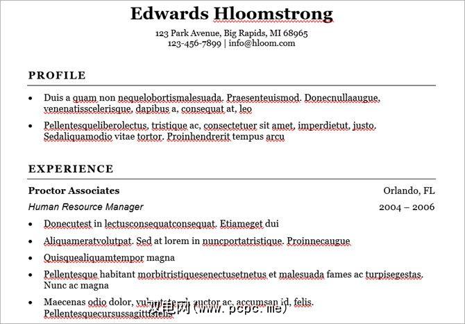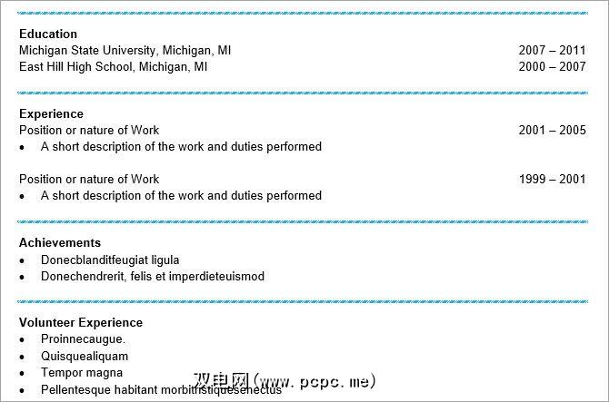 对于另一个简单的简历模板,此模板提供了带有其他部分的基础知识。您将在顶部看到您受教育和经历的地方。然后,您可以将列表格式用于成就,志愿工作和工作技能。