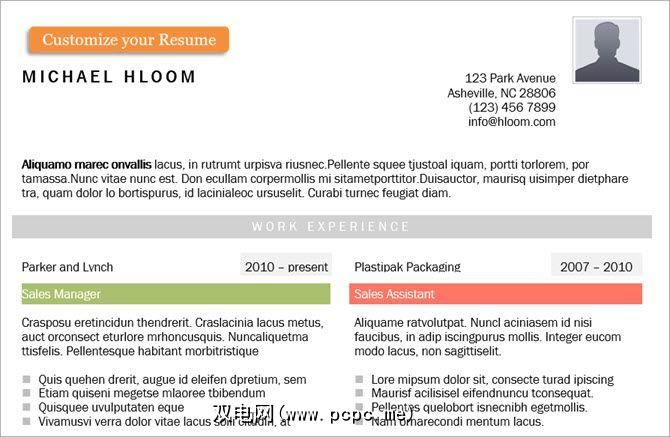 也许信息图表简历会让您感兴趣。这提供了一种有吸引力的布局,其中有几种颜色和照片点。在您的工作中,每个职位都有不同的彩色标题,这对于潜在的雇主来说很容易扫描。它还为您提供了一个时间表,以显示您的工作日期和技能等级表部分。