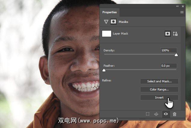 第3步。 / strong>打开属性面板并单击 Inver t按钮以黑色填充蒙版。反转遮罩时,您可以灵活地仅对图像的特定部分进行调整(在这种情况下为牙齿)。黑色遮盖了由于振动层而引起的去饱和。