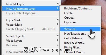 第1步。创建“ Vibrance Adjustment Layer"。转到图层>新调整图层>鲜艳度。