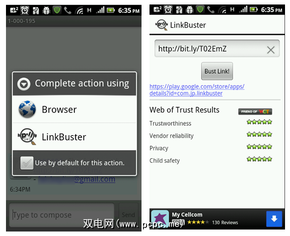 不久前,一个SMS网络钓鱼漏洞被发现,该漏洞可能会影响使用任何版本Android的任何人。如果您想即使在移动设备上也能保持链接的安全,LinkBuster可以帮助您扩展遇到的任何链接,无论是在线链接还是短信。您可以按原样运行LinkBuster,并手动粘贴链接以展开,或者在单击链接而不是浏览器时选择LinkBuster。 LinkBuster不仅为您扩展了链接,还使用Web of Trust(信任网络)对其进行了扫描,并告诉您该链接的可信度。
