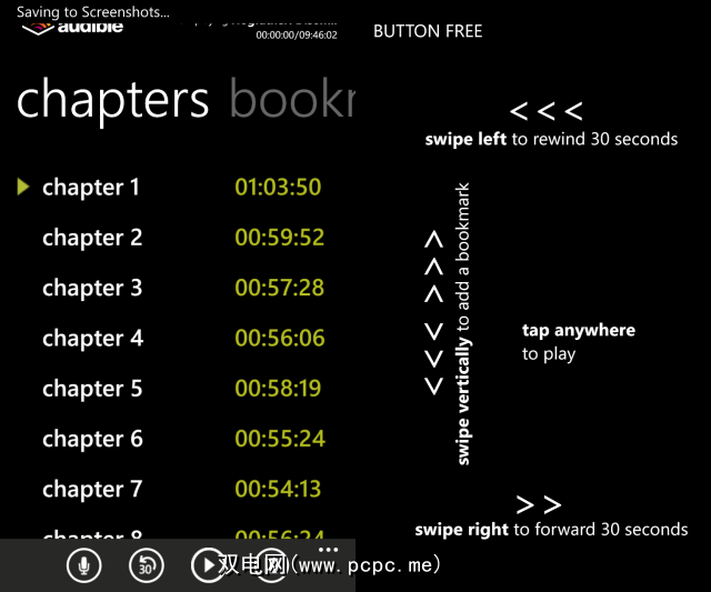 播放和跳过返回30 按钮是不言自明的。使用书签设置一个点,以在下次打开应用程序时返回该点(这些内容在“书签"页面中列出)。最后,在应用程序中启用了语音以便在美国用于车载Windows Phone设备。