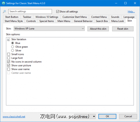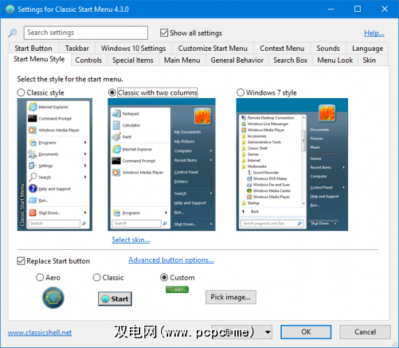一旦安装,请打开Classic Shell,然后转到开始菜单样式标签。根据您的喜好选择经典样式或两列经典。然后单击下面的选择皮肤…。