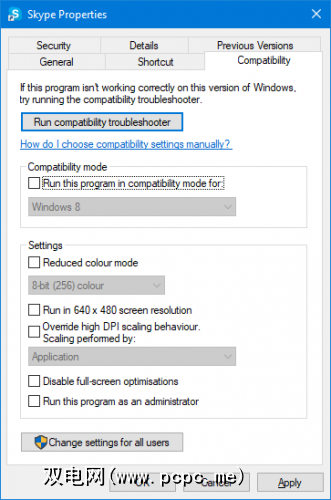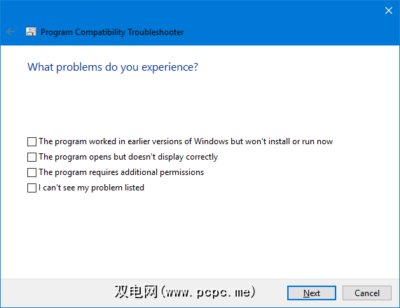 否则,请再次右键单击该程序,然后单击< strong>属性。在打开的窗口中,点击兼容性标签,然后点击运行兼容性问题排查工具。这将尝试自动检测并解决问题。