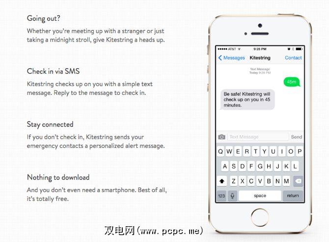 一条简单的短信仍然很强大。如果准时交货。 Kitestring依靠良好的旧SMS定期对您进行检查。如果您不回复短信,它将向您的紧急联系人发送个性化的警报消息。