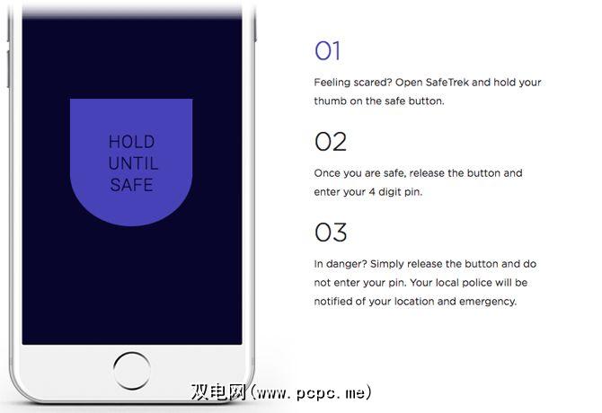 应用上的单个按钮可作为触发器。感到有危险时,请按住它。它充当静音警报,警察将赶到您的位置。当您感觉到危险已经过去时,松开它。您还必须输入4位数的PIN码以确认您确实安全。