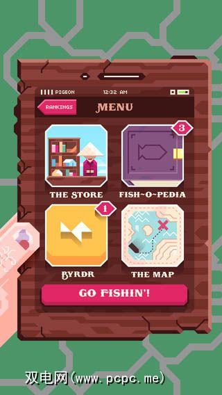 在签字之前,我只需要提及荒谬的捕鱼活动所提供的精美演示。这些图形是对过去8位街机游戏的一种致敬,使游戏具有独特的风格和浓厚的风格。这确实使它与克隆区别开了,相比之下,克隆看起来很卡通而且便宜。另一个不错的功能是您的角色所使用的木制智能手机,该智能手机用作进入商店的主菜单,Fish-o-Pedia形式的渔获量清单,前往不同区域的地图以及类似于Twitter的虚构社交网络,称为Byrdr。
