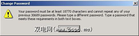 甚至更好的是,Windows希望通过确保此超级密码与上一个密码不同来加强安全性。 30,689个密码。复制超过18,000个字符(约9,300个单词!)的机会是什么?密码管理员可以保存这么长时间的密码吗?一位reddit用户估计,一个普通的打字员大约需要45分钟才能输入这么多字符。 Service Pack3。Microsoft还有益地指出:“安装SP1时,所需的字符数从17,145更改为18,770。"这为那些想知道为什么突然需要额外增加1,625个字符的人们提供了必要的解释。
