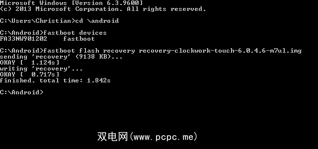 下一步,打开命令行,切换到您的Android目录( cd \ Android )并使用您的手机处于快速启动模式并连接到计算机,请输入: