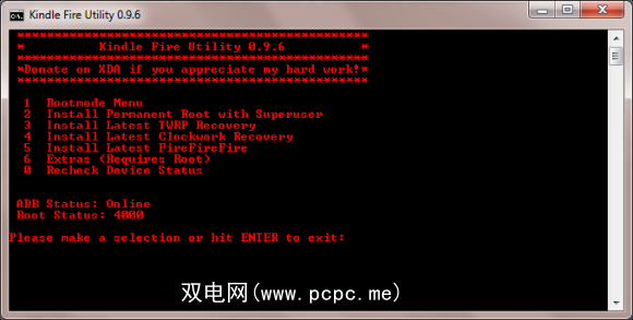 您现在已经准备好扎根Kindle Fire。在Windows资源管理器中,返回Kindle Fire Utility文件夹,然后双击 run.bat 。您应该会看到“ ADB状态"列为“联机"。