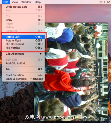 现在转到 Edit 菜单。在菜单中间,您将看到四个选项:向左旋转,向右旋转,水平翻转和垂直翻转。选择适合您需要的选项。在我的示例中,我需要将视频向左旋转。