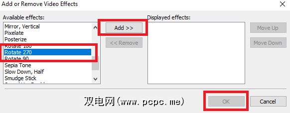 现在,右键单击您的视频,然后从上下文菜单中选择 Video Effects 。该应用程序将显示广泛的工具列表。向下滚动,直到找到旋转选项。单击添加,然后单击确定。