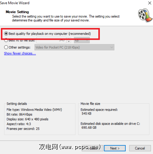 要保存新旋转的视频,请转到文件>保存电影文件,然后单击各种屏幕选项。进入电影设置屏幕时,请确保选择“我的电脑上的最佳播放质量" 。仅当您要减小视频的文件大小时,才应使用其他选项。