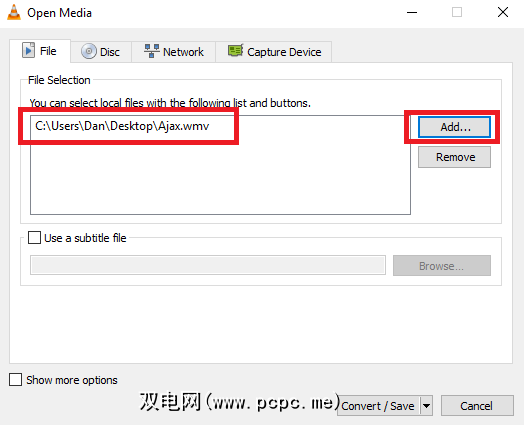下一步,转到媒体>转换/保存,然后使用添加按钮以选择原始文件。