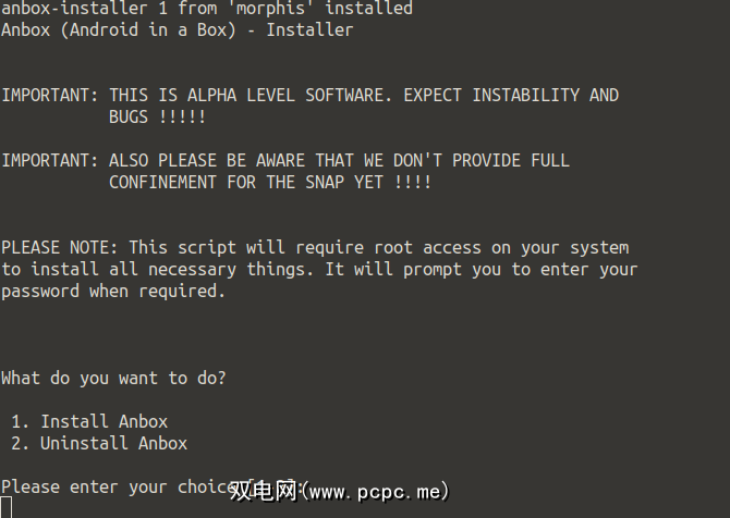 如果您以后需要删除该软件,只需运行上面的installer命令,然后选择选项2。但是,在安装Anbox的情况下,您可以继续执行选项1。