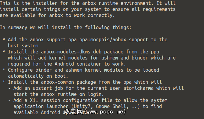 此后,您将看到安装过程的摘要。例如,突出显示了从PPA添加的文件,以及 anbox运行时(使其他软件和应用程序运行的软件库)在登录Linux时将自动启动的信息。<