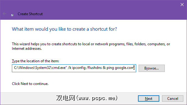 “ C:\ Windows \ System32 \ cmd.exe" / k [此处需要的命令] ,确保将括号内的文本替换为所需的命令跑步 。