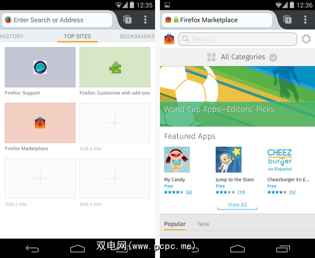 您现在可以在Android上安装Firefox OS应用。 Firefox for Android支持Mozilla的“开放式Web应用程序",使您可以直接在Android设备上安装和运行Firefox OS应用程序。就像Amazon App Store一样,Firefox Marketplace现在可以用作Android的替代应用商店。