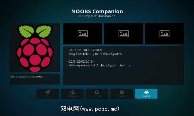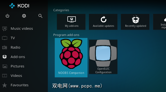 导航到附加组件>我的附加组件,然后从存储库安装。选择 MattHuisman.nz存储库,然后选择程序附件> NOOBS伴侣。选择安装,然后等待附件下载。等待弹出确认框,然后退出到主屏幕。